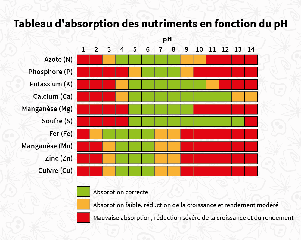 La plage d’assimilation optimale se situe entre 6,0 et 6,5, c’est alors que la plupart des nutriments sont absorbés. En cas de déséquilibre, la plante présentera des symptômes de carences.