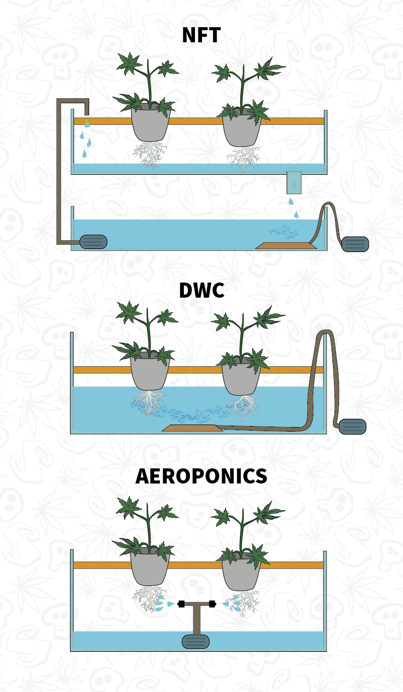 - DWC (Deep Water Culture): Perfecto para principiantes. Las raíces crecen directamente en agua oxigenada con nutrientes.