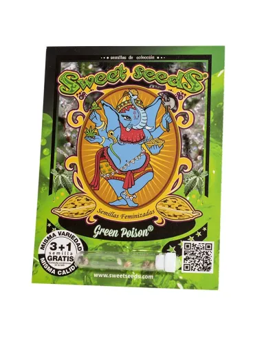 Variedad fotodependiente desarrollada buscando una genética de floración muy rápida y alta homogeneidad entre individuos. Las plantas de Green Poison® muestran excepcional vigor en las primeras semanas de floración y están listas para cosechar a las 7 semanas del cambio del fotoperíodo. En exterior es muy apropiada para el cultivo en zonas de clima húmedo, ya que suele ser posible cosechar las plantas antes de las primeras lluvias y noches frías de final de verano.