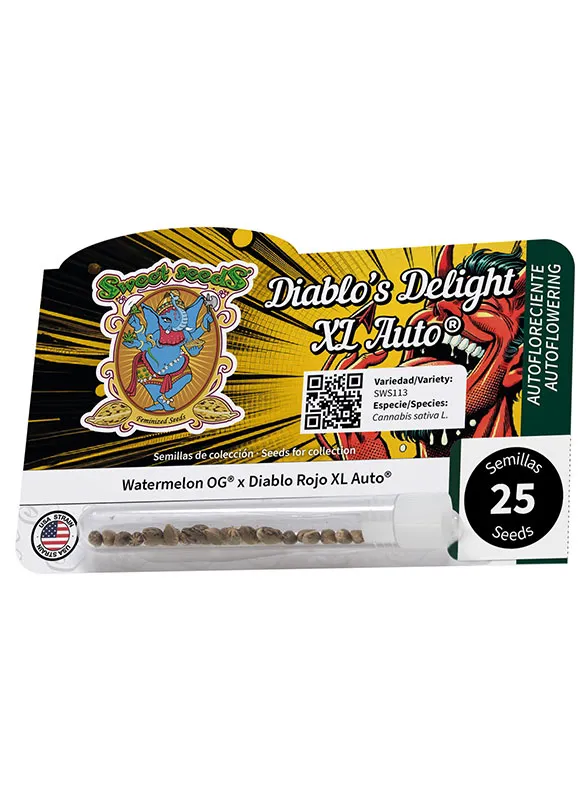 Při vývoji Diablo’s Delight XL Auto® jsme použili vybranou genetickou linii naší exkluzivní Diablo Rojo XL Auto® [Dark Devil Auto® (SWS38) x Strawberry Cola Auto] jako genetický základ. Pro zvýšení celkové kvality rostliny, přidání výjimečného aromatického profilu a ohromující krásy jsme do směsi přidali elitní klon Watermelon OG, pečlivě střežený klenot výzkumného oddělení Sweet Seeds®. Výsledkem je moderní hybrid s vysokým stonkem a vynikajícími organoleptickými vlastnostmi.