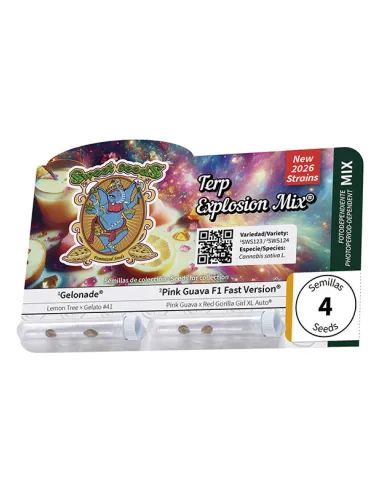 Terp Explosion Mix® fusiona dos variedades fotodependientes del más alto nivel: Gelonade® (SWS123) y Pink Guava F1 Fast Version® (SWS124). Hemos reunido los aromas y sabores más intensos del 2026, el perfume de estas variedades debería ser declarado patrimonio sensorial de la humanidad.